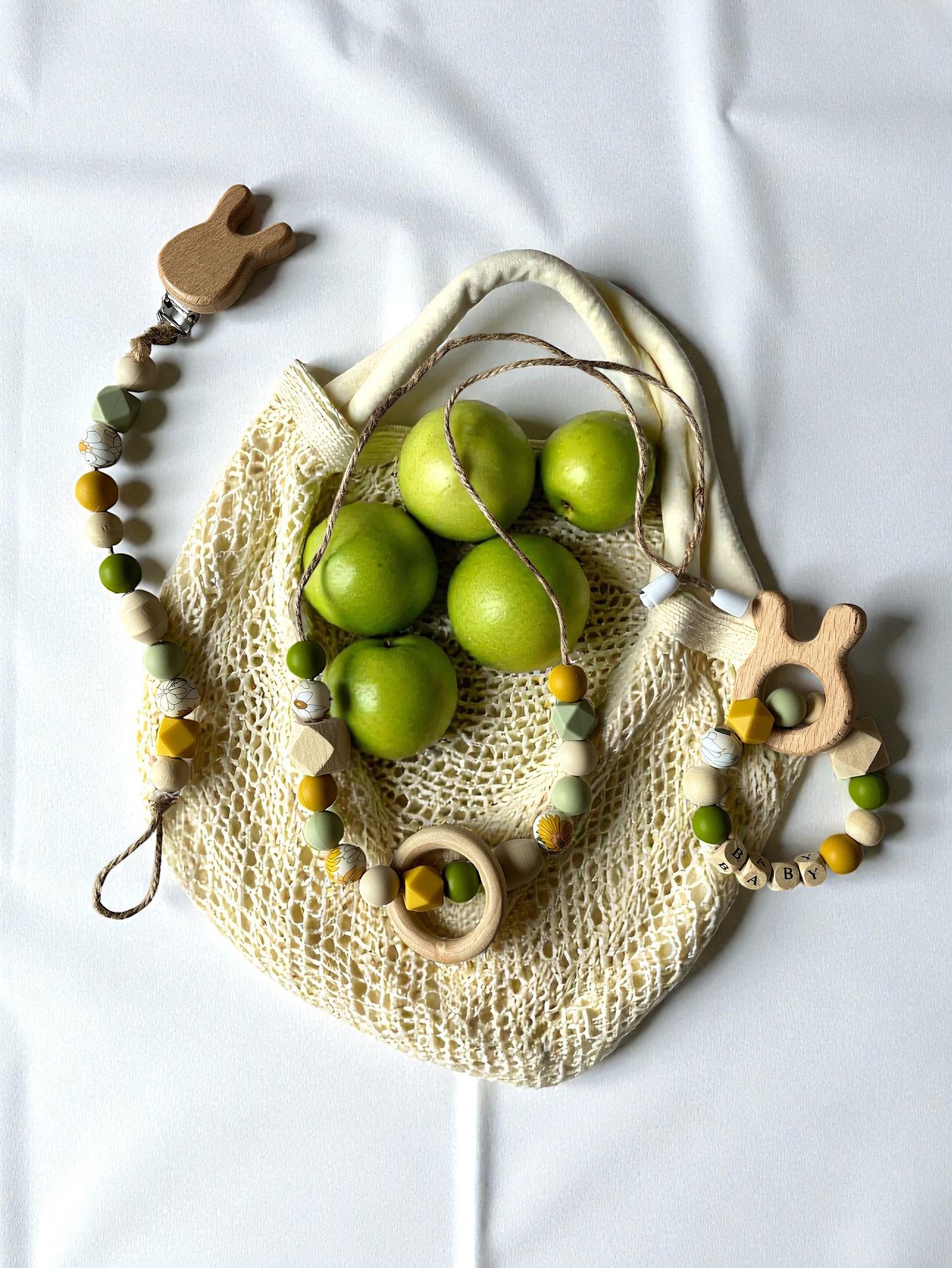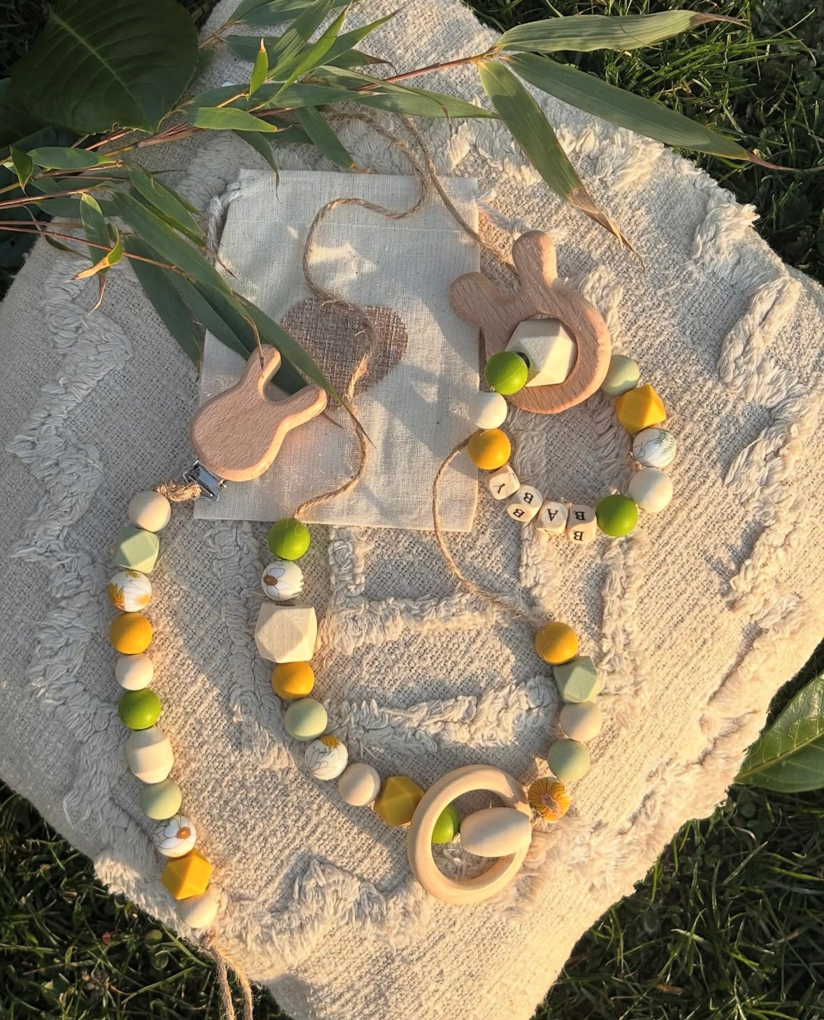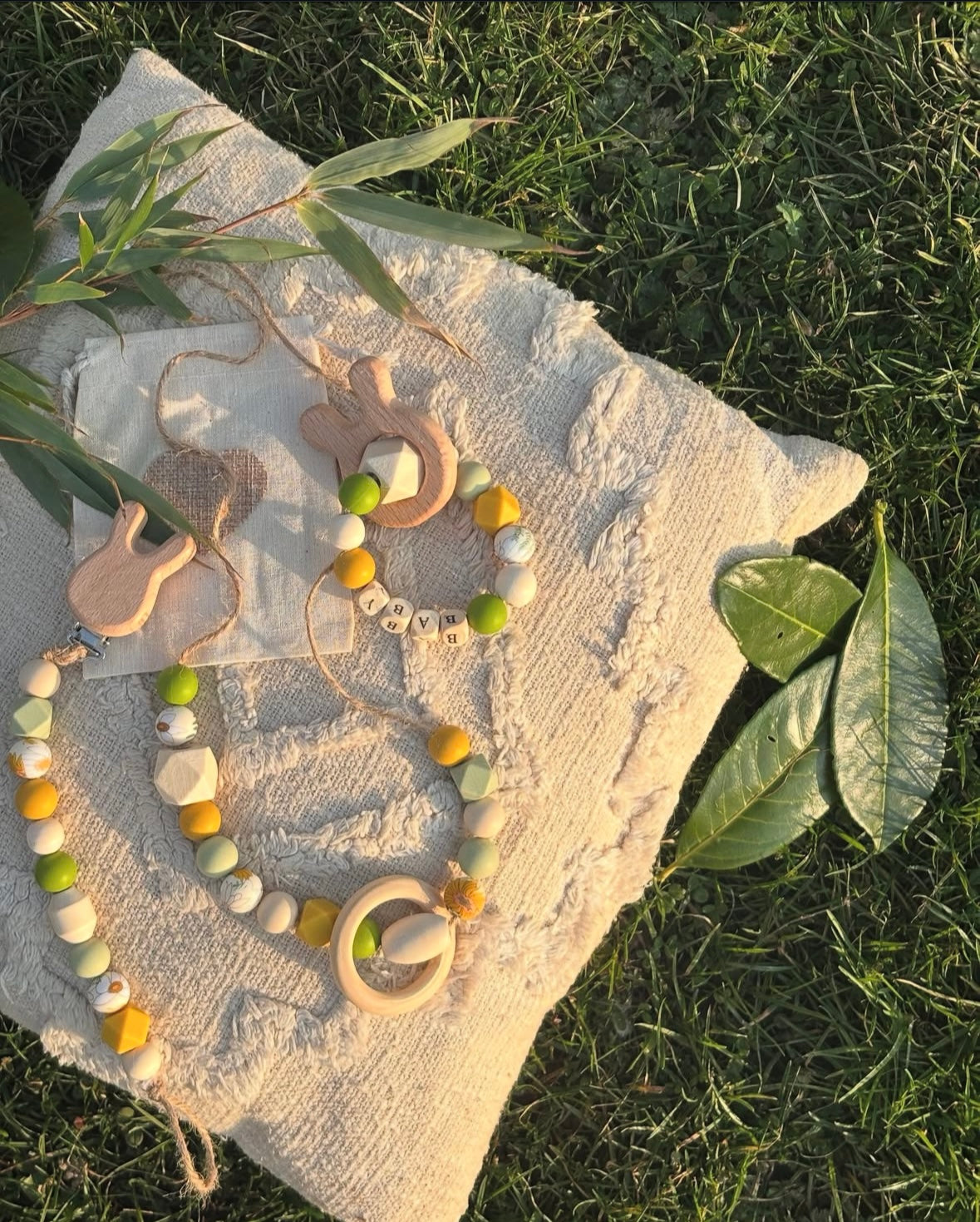 Chaque bijou est entièrement fait main, avec des perles de silicone douces et colorées, pensées stimuler les sens de bébé tout en apportant une jolie touche de tendresse.
